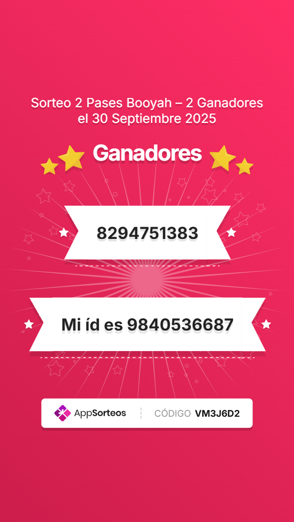Nos alegra anunciar a los ganadores del sorteo de 2 Pases Booyah realizado el 30 de septiembre de 2025. Su entusiasmo y participación nos inspiran a seguir creando más eventos y sorpresas para toda nuestra comunidad.