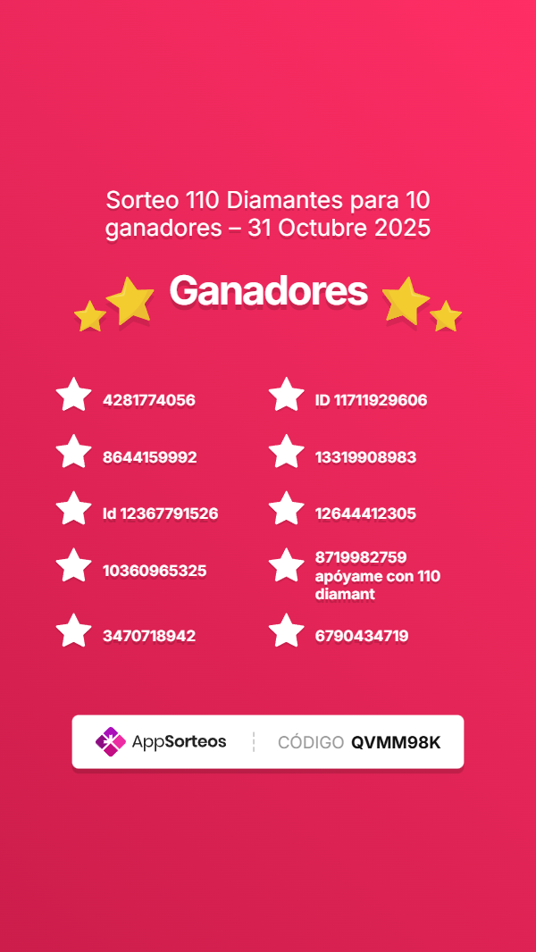 Nos alegra anunciar a los 10 ganadores del sorteo de diamantes realizado el 31 de octubre de 2025. Una vez más, su increíble participación y entusiasmo nos motivan a seguir creando eventos para premiar a toda nuestra comunidad.