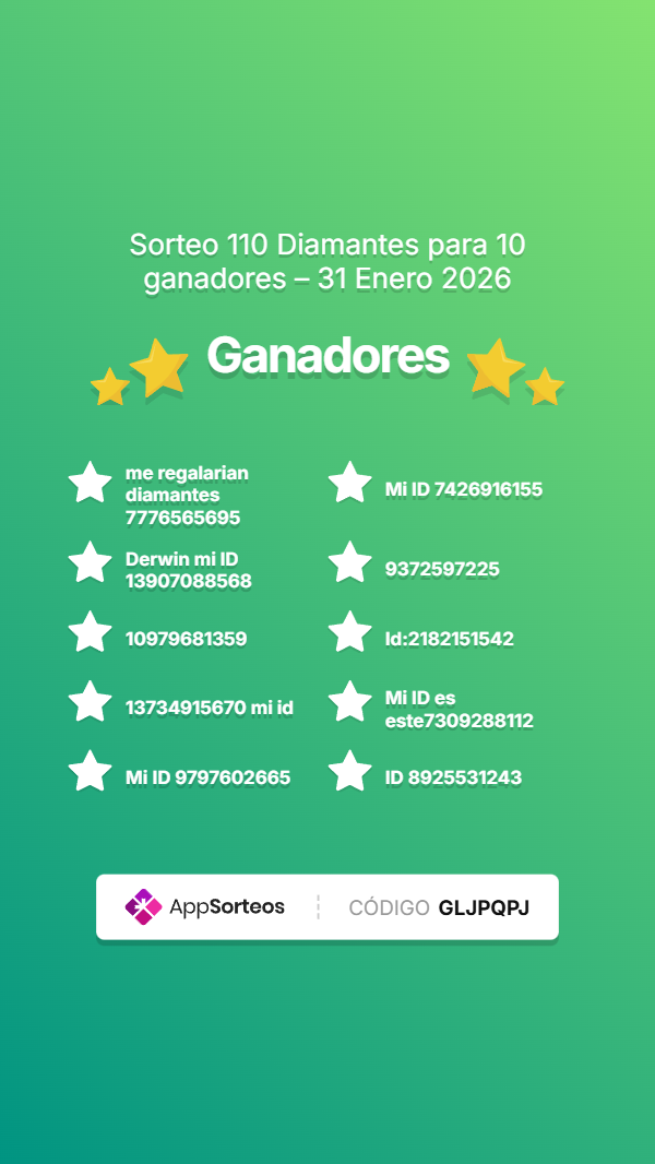 Nos alegra anunciar a los 10 ganadores del sorteo de 110 Diamantes, realizado el 30 de enero de 2026. Una vez más, su increíble participación y entusiasmo nos motivan a seguir creando eventos para premiar a toda nuestra comunidad.